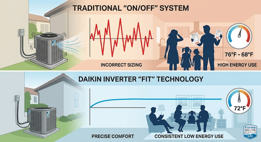 Daikin systems often feature Variable-Speed Inverter Technology. Unlike traditional systems that are either 0% or 100% “on,” these systems adjust their speed in tiny increments to maintain a steady temperature.